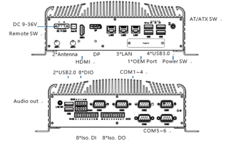 CPU:第六代BGA Intel Skylake-U Celeron和Core I3/I5/I7 ULT Soc TDP 15W: Celeron 3855U 1.6GHz双核双线程 Core-U: I3-6100U 2.3GHz双核四线程, I5-6200U 2.3-2.8GHz双核四线程, I7-6500U 2.5-3.1GHz双核四线程 系统内存 : 2*260-Pin SODIMM, 双通道DDR4 2133MHz, 最大32GB 扩展接口:1*全长Mini PCIe带PCIe X1+USB信号及SIM卡槽; 1*M.2 2242 B-key带PCIe+USB信号及SIM卡槽,支持双 4G卡无线网络和Wifi/BT无线通讯模块 显示:CPU集成Intel Gen. 9th HD Graphics, HEVC/H265 HW高清编解码,HDMI最高分辨率3840*2160@30Hz, DP最高分辨率4096*2304@60Hz 音频: Realtek ALC662VD高清音频, 支持5.1声道 以太网 :2*Intel I211AT(可选I210AT) PCIe Gig. Ethernet, 10/100/1000Mbps自适应; 1*Intel I219 LM支持iVpro技术 键盘&鼠标: USB键盘和鼠标 存储 1*2.5″ 减震驱动架, 贴合到底板加强散热 , SATA3 6.0Gbps HDD/SDD; 1*mSATA全高卡, 支持AHCI模式 DIO:8位TTL信号可编程输入输出; 8位2.5KV光隔离输入(H:5-24V, L:0-1.5V), 8位2.5KV光隔离输出(100mA), I-port:可选2*USB2.0、LVDS或Mini PCIe功能卡接口, 如并口或串口 I/O接口: 3*RJ45 w/ LED Gig-LAN (前面板) 4*USB3.0 Type A (前面板), 2*USB2.0 Type A(后面板) ,1*USB2.0 Type A内置 2*5pin凤凰端子(8位DIO后面板); 1*10pin凤凰端子(8位隔离DI后面板), 1*10pin凤凰端子(8位隔离DO后面板) 4*RS232/422/485 DB9 公头(后面板), 2*RS232DB9 公头(后面板) 1*Audio-out 3.5mm音频接口(后面板) 1*HDMI 立式type A(前面板)和1*DP type A(前面板) 指示灯:1*电源指示灯, 1*硬盘指示灯, 3*CPU温度等级指示灯(Red为警告, Yellow为高温, Green为常温) 电源要求 :DC IN 9~36V, 3pin端子(前面板), 带反接、短路、过压和过流保护, TDP: TBD 看门狗定时器 : 可编程超时中断或系统复位,1到255秒 操作系统:Windows 7, Windows 10, Linux Fedora Ubuntu 构造 :铝矩型材散热外壳,SGCC前后烤漆面板底盖